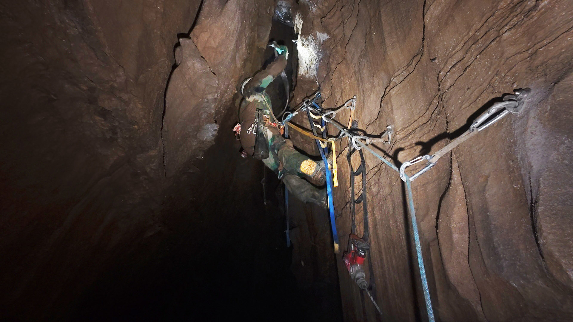 On the drive to the cave, Max, Amy, and I traded Spotify tracks. I submitted “The Drill.” Not everyone’s taste, but it grows on you. Its flat pulse stream pairs well with the experience of standing in a swinging etrier, helmet lamp glaring, arm fully extended, ropes and gear tangling, water dripping down your back, mud in your eye. You are wearing goggles, right?