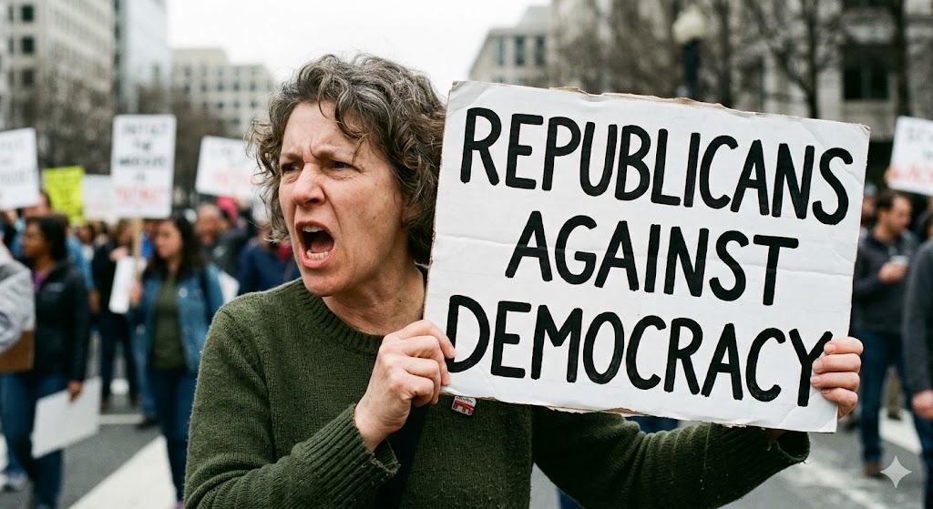 Media bias, including social media hosted by big concerns like Facebook, X and Google, is an obvious source of concern. Case in point: Google’s apparent attempt to coerce me right here. I intended to call this essay “Democrats Against Democracy.” So I asked Google Gemini to make me an image of an angry man holding a sign saying “Democrats against democracy.”