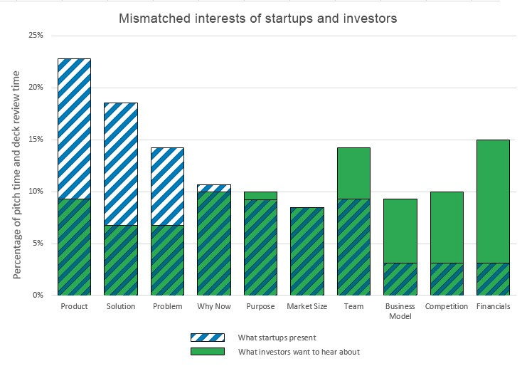 The combined data on investor viewing time versus founder presentation time reveals a clear mismatch of interest (see chart). From the investor’s perspective, founders still talk far too much about the problem, the solution, and how the product delivers the solution. Conversely, founders talk far too little about the business model, the competition, and financials.