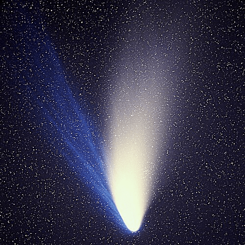 Background: My grandfather saw Comet Halley in 1910, and it was the biggest deal since the Grover Cleveland inaugural bash. We discussed it – the comet, not the inaugural – often in my grade school years. He told me of “comet pills” and kooks who killed themselves fearing cyanogens. Halley would return in 1986, an unimaginably far off date. Then out of nowhere in 1973, Luboš Kohoutek discovered a new comet, an invader from the distant Oort cloud – the flyover states of our solar system – and it was predicted to be the comet of the century. But Comet Kohoutek partied too hard somewhere near Saturn and arrived hungover, barely visible. And when Halley finally neared the sun in 1986, the earth was 180 degrees from it. Halley, like Kohoutek, was a flop. But 1996 brought Comet Hale-Bopp. Now, that was a sight even for urban stargazers. I saw it from Faneuil Hall in Boston and then bright above the Bay Bridge in San Francisco. It hung around for a year, its dual tails unforgettable. And as with anything cool, zealots stained its memory by freaking out.