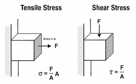 Stress = force ÷ area. Pull 10 pounds on a one-square-inch rod, you get 10 psi. Pull 100 pounds on ten square inches, you also get 10 psi. This is an example of tensile stress.