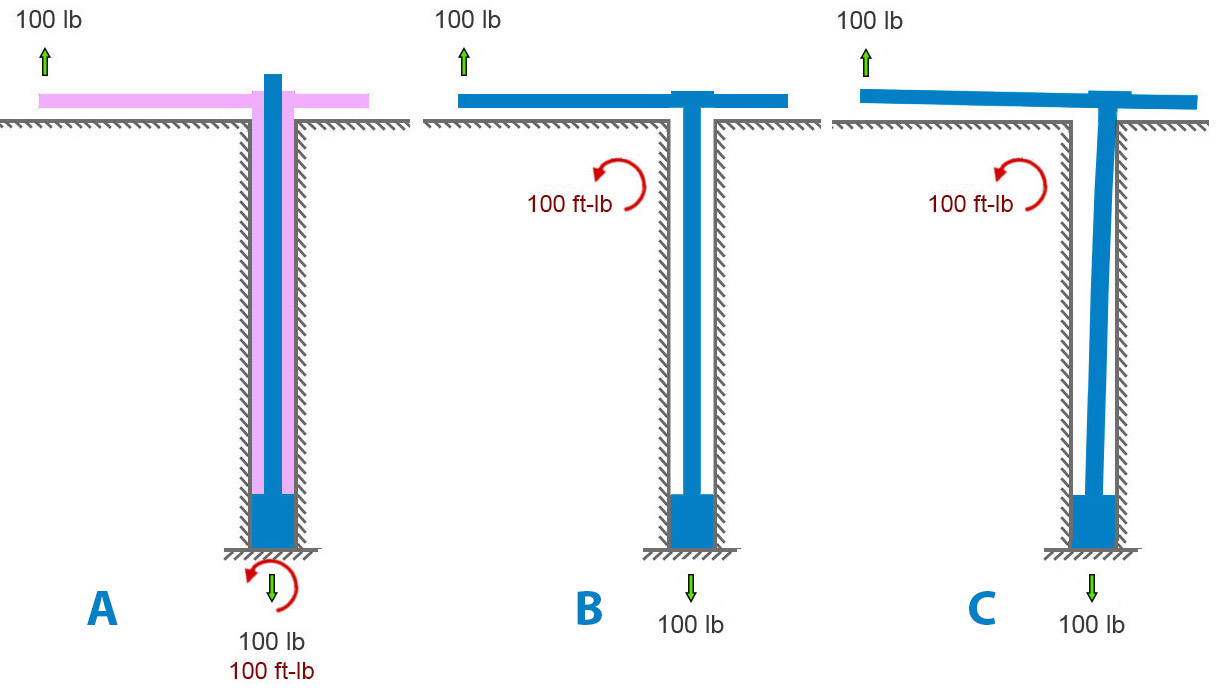 Figure A below shows an applied load of 100 pounds upward on the hanger. The bolt is anchored to rock at its base, at the bottom of the hole. A blue bolt is inside a pink hanger-sleeve assembly. The rock is pulling down on the base of the bolt with a force equal and opposite to the applied load. And the rock must apply a 100 ft-lb moment to the assembly to satisfy Newton. In figure A, it’s shown at the bottom of the hole.