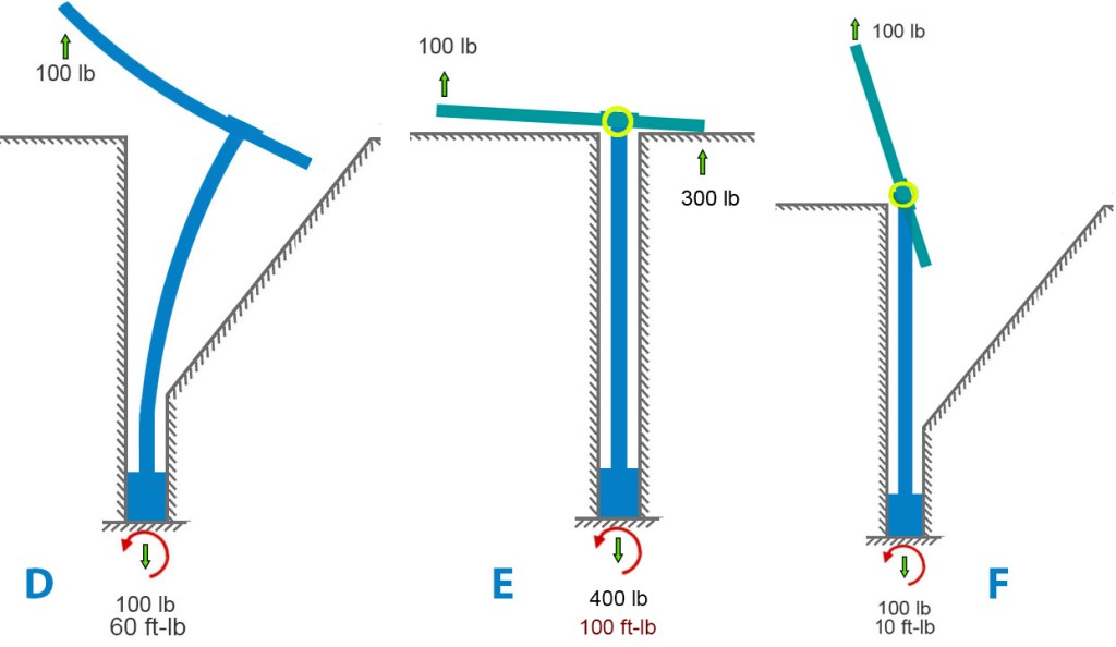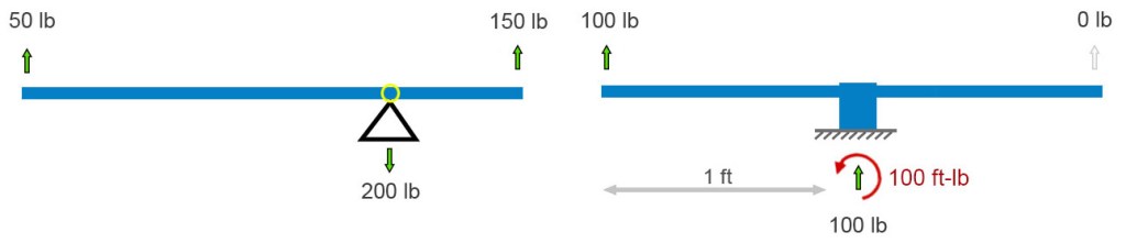 If the fulcrum – the pivot point – freezes up or is otherwise made immobile, the balancing act is no longer needed. The vertical forces still balance each other (cancel each other out), but now their is a twist on the base. Its left side wants to peel up. In addition to the sum of forces equaling zero, the sum of all twists must also sum to zero. A twist – I’ll use its physics name, moment – is defined as a force times the perpendicular distance through which it acts. In the above-right diagram, the 100 lb force is 1 foot from the base, so it applies a 100 ft-lb clockwise moment to the base (1 foot times 100 pounds = 100 ft-lb). (Notice we multiply the numbers and their units.) Therefore, to keep Isaac Newton happy, the ground must apply a 1 ft-lb counterclockwise moment (red curved arrow) to the base and beam that is fixed to it.