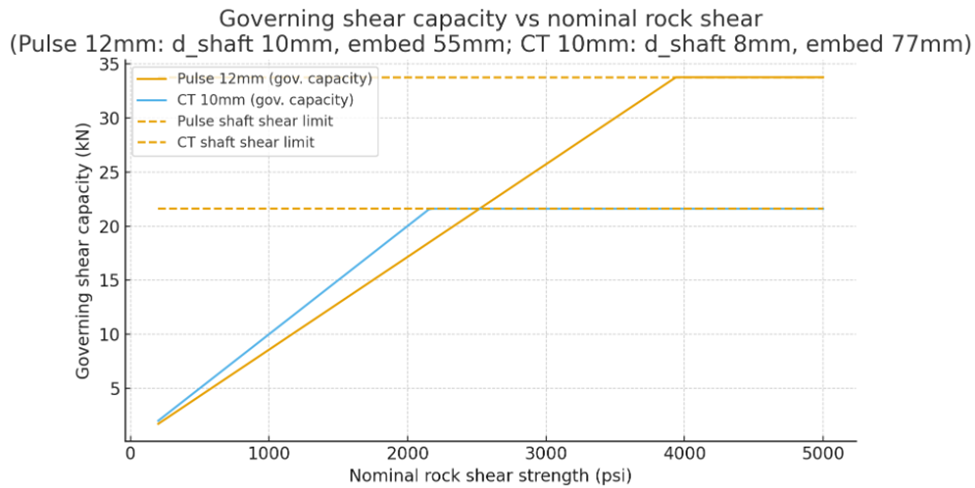 Both M8 and 3/8 exceed 6.3 kN, confirming that the analysis hinges on shear strength, not friction, for high-load cases. Torquing is critical to achieve the assumed preload (near yield) and to confirm placement quality (a torqued bolt indicates a successful installation). However, in high-load cases (≥6.3 kN), the frictional capacity is irrelevant once exceeded, and the analysis stands on the bolt’s shear strength and the rock integrity.