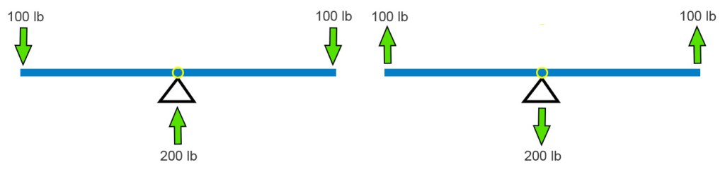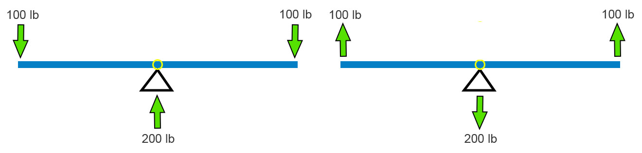 The classic balanced see-saw is at left below. The two 100 lb weights balance each other. The base pushes up on the beam with 200 pounds. We see Newton’s 1st Law in action. Sum of the down forces = sum of the up forces. If we say up forces are positive and down are negative, all the forces on the beam sum to zero. Simple. The see-saw works in tension too. Pull up with 2 ⋅ 100 pounds and the base pulls down by the same amount.