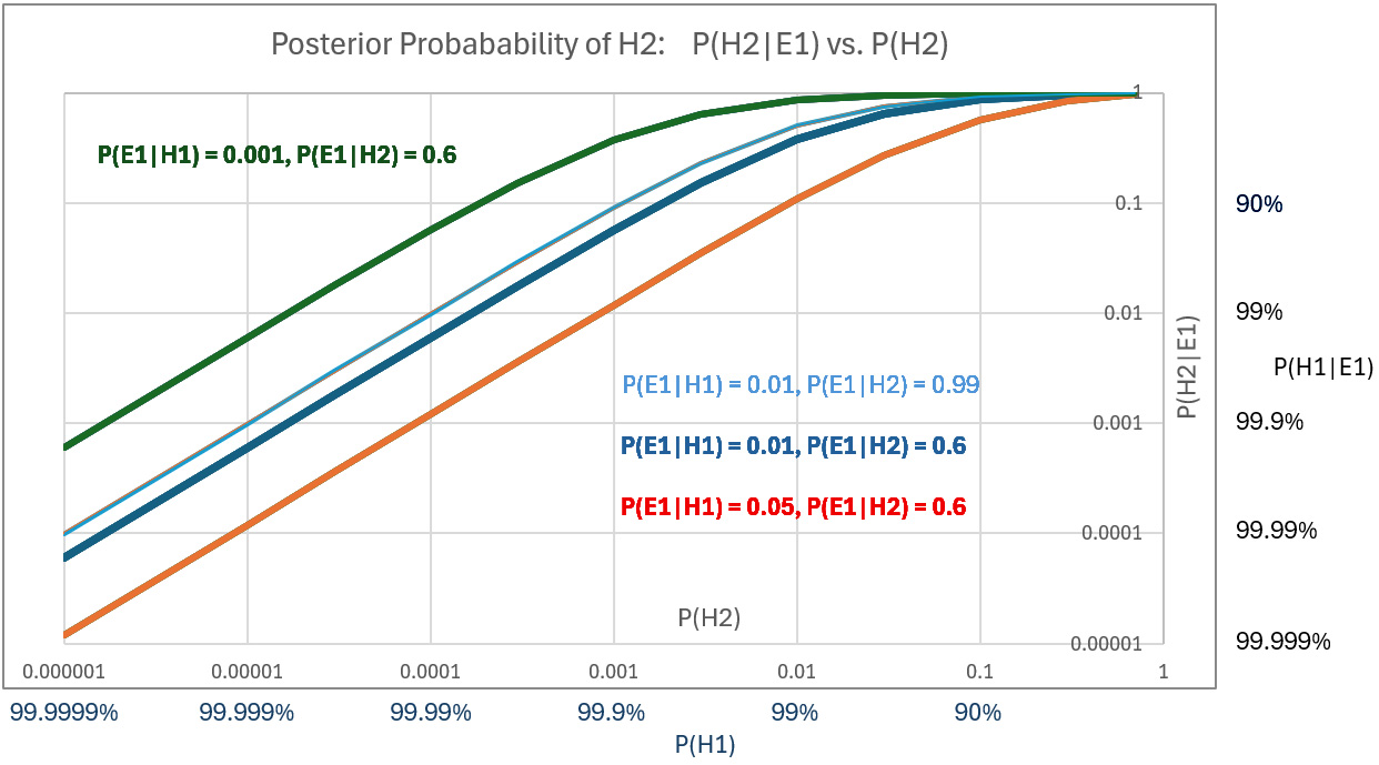 This is independent corroborating evidence – evidence of something anyway. Alfie now receives a report that raises the likelihood Tommy’s story is true (P(E|¬H) drops, P(E|H) rises). So Alfie updates his belief in Tommy’s credibility, lowering his confidence that he can push for 100%.