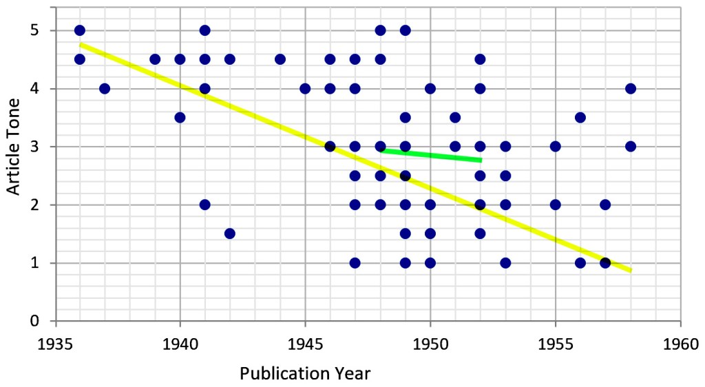 The article’s approach was to randomly distribute articles to two evaluators for quantitative review. The reviewers then rated the tone of the article on a five-point scale. I plotted its data, and a linear regression (yellow line below) indeed shows that the non-clinical press cooled on lobotomies from 1936 to 1958 (though, as is apparent from the broad data scatter, linear regression doesn’t tell the whole story). But the records, spotty as they are, of when the bulk of lobotomies were performed should also be considered. Of the 20,000 US lobotomies, 18,000 of them were done in the 5-year period from 1948 to 1952, the year that phenothiazines entered psychiatric clinical trials. A linear regression of the reviewers’ judgements over that period (green line) shows little change.